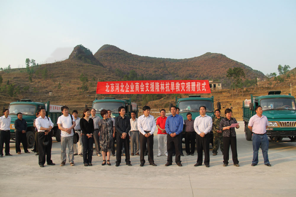 2010年4月10日,北京河北商会新冀商慈善基金不远万里来到广西百色隆林,为灾区带来河北企业家的爱心,据了解,目前隆林有25万人饮水困难,16个乡镇169个村的2万9千多人需要送水,而且由于旱情没有缓解,需要送水的人数还在不断增加,但目前隆林全县只有25辆送水车,确保群众用水难度极大,因此北京河北商会冀商基金向灾区捐赠了5台专用抗旱运水车帮助解决当地群众最急需解决的用水难题。