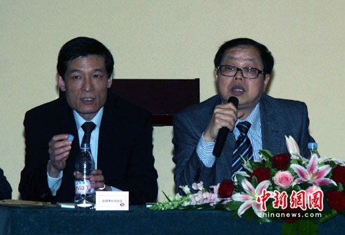 图为黄方方(右)在向旅法华商介绍南宁的情况 中新网发 卫中 摄